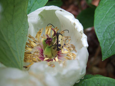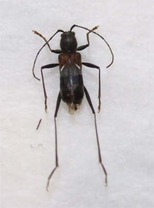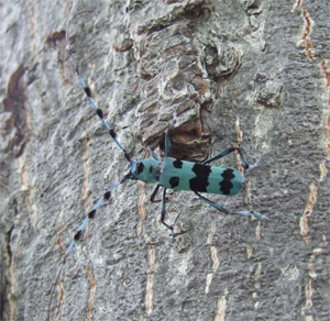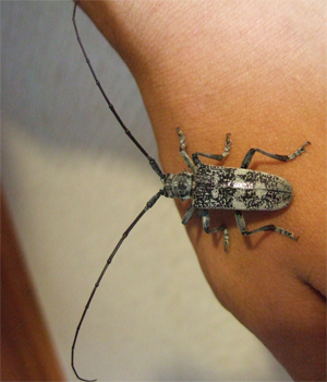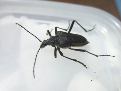 これは一見ゴマダラカミキリなどふつうのカミキリに見えますが、ヨコヤマヒゲナガカミキリという、ブナ林にのみ見られる珍しいカミキリです。本物は大理石のようにぴかぴかと光っています。