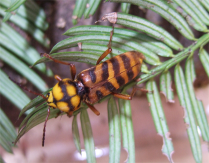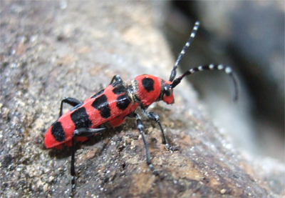 これはアカジマトラカミキリ。日本のムシとは思えない色彩をしています。
