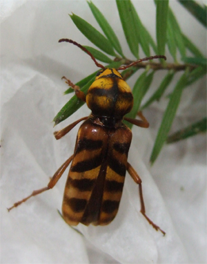 これもまたトラカミキリの1種、ハセガワトラカミキリです。ブドウのようなかなりあちこちに普通に生えている木を食べるにも関わらず、大変珍しいカミキリです。